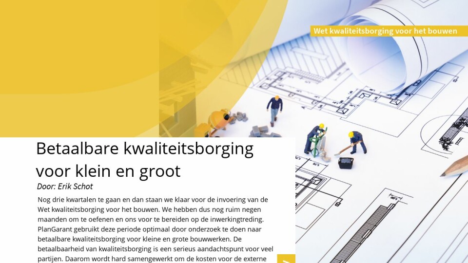 Nog drie kwartalen te gaan en dan staan we klaar voor de invoering van de Wet kwaliteitsborging voor het bouwen. We hebben dus nog ruim negen maanden om te oefenen en ons voor te bereiden op de inwerkingtreding. PlanGarant gebruikt deze periode optimaal door onderzoek te doen naar betaalbare kwaliteitsborging voor kleine en grote bouwwerken. De betaalbaarheid van kwaliteitsborging is een serieus aandachtspunt voor veel partijen. Daarom wordt hard samengewerkt om de kosten voor de externe borger zo laag mogelijk te houden.