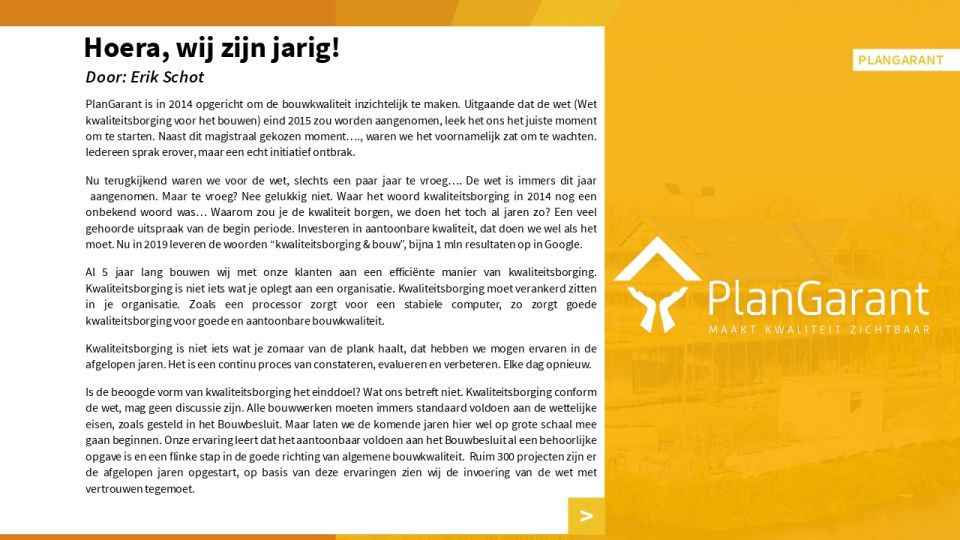 PlanGarant is in 2014 opgericht om de bouwkwaliteit inzichtelijk te maken. Uitgaande dat de wet (Wet kwaliteitsborging voor het bouwen) eind 2015 zou worden aangenomen, leek het ons het juiste moment om te starten. Naast dit magistraal gekozen moment…., waren we het voornamelijk zat om te wachten. Iedereen sprak erover, maar een echt initiatief ontbrak.